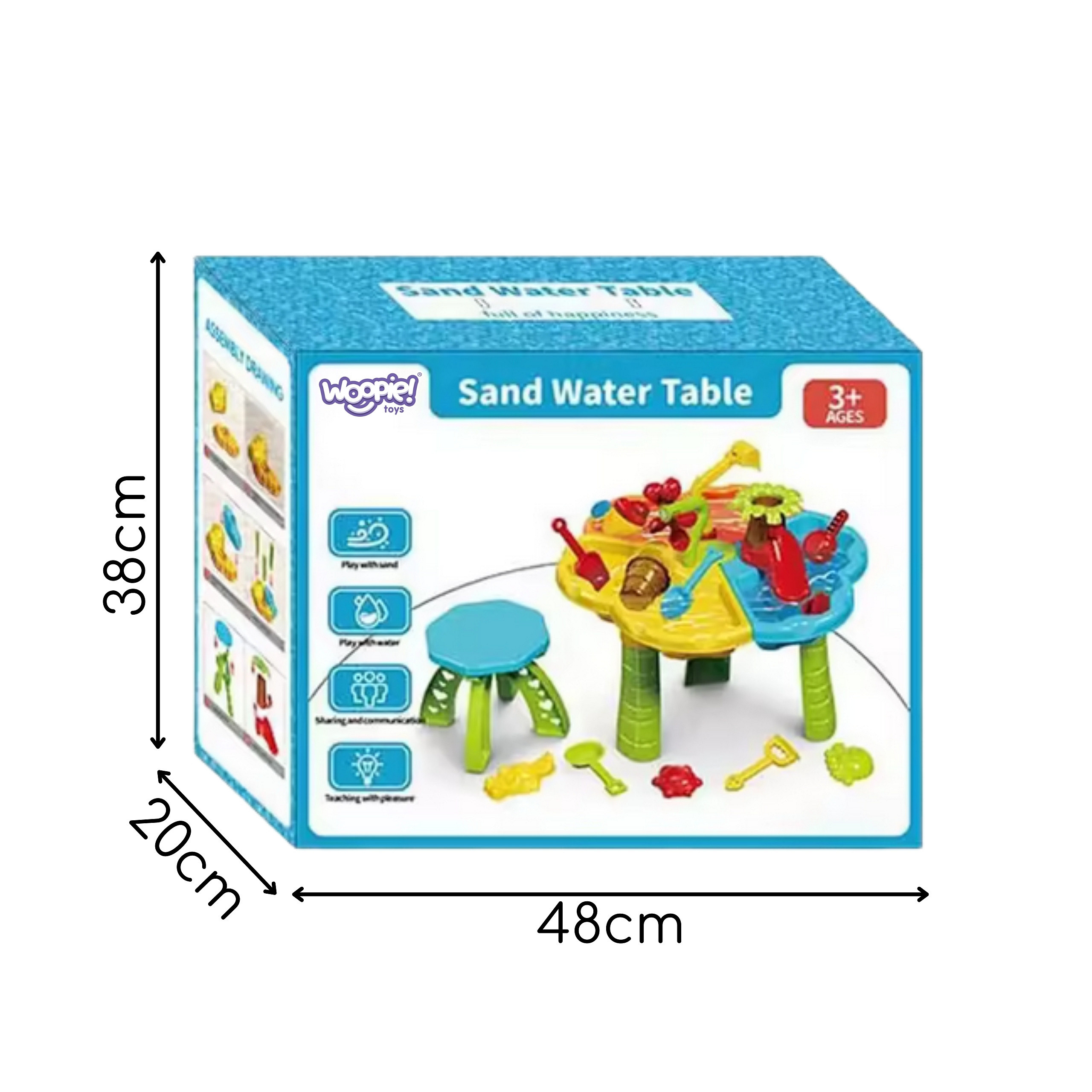 Vodní stolek 2v1 s židličkou od značky Woopie je všestranná sada pro hru s vodou a pískem, která byla navržena s ohledem na potřeby nejmladších objevitelů. Ideálně se hodí jak do domu, na balkon, terasu, tak i do zahrady nebo na pláž.Hračka rozvíjí kreativitu, představivost a manuální dovednosti, poskytuje hodiny plné úsměvu a učení. Díky bohatému vybavení a solidnímu provedení se tato barevná sada osvědčí jak na zahradě, tak v dětském pokoji.Vyrobena z bezpečného, odolného a snadno čistitelného materiálu, bez ostrých hran, je zcela bezpečná pro malé děti. Trojitá konstrukce stolečku umožňuje dětem současně experimentovat s různými strukturami a materiály – pískem, vodou a doplňky ze sady.Každý z prvků sady byl navržen tak, aby podněcoval dětskou představivost – najdeme zde minibagr, trychtýř-stromek, vodní mlýnek, formičky na písek, lodičku, lopatky a mnoho dalších barevných doplňků. Díky tomu může dítě hrát scénky, tvořit pískové tvary, přelévat vodu, stavět a experimentovat – učit se hrou. V sadě se nachází také barevná a ergonomická židlička, která zajišťuje pohodlí při hraní. Celá je snadno složitelná a rozložitelná, což z ní činí vynikající řešení jak pro každodenní použití, tak na cestování. Hračka nevyžaduje použití nástrojů – vše se spojuje intuitivně a stabilně.Stolek není jen místem pro zábavu, ale také nástrojem pro učení – podporuje rozvoj motoriky, koordinace zraku a pohybu, manuálních dovedností, logického myšlení, a také komunikace a sociálních dovedností, zejména při hře s vrstevníky. To je ideální hračka pro společné, radostné chvíle, které zároveň rozvíjejí a učí.