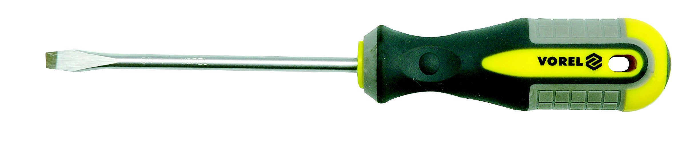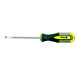 Plochý šroubovák 3x100 mm. Vyrobeno z chrom-vanadiové CrV oceli. Špička má saténový povrch, dodatečně pískovaná a magnetizovaná, což umožňuje pevné uchopení hlavy šroubu. Rukojeť je vyrobena ze dvou kompozitního plastu. Otvor v rukojeti umožňuje zavěsit šroubovák.