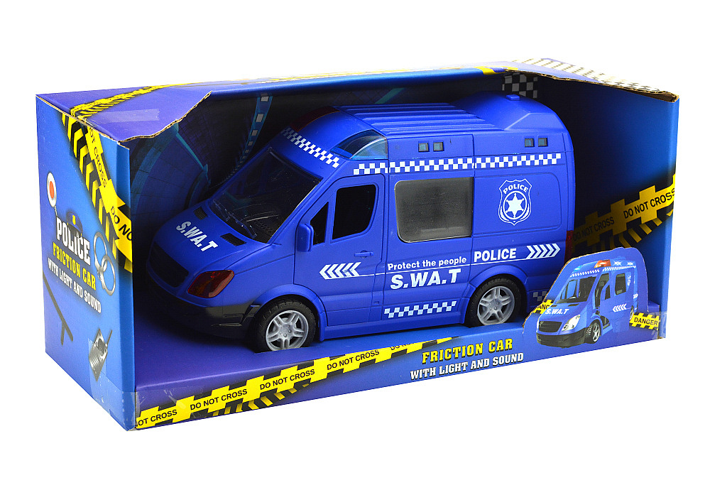 Vozidlo má otevírací dveře a motorek na setrvačník. Stisknutím tlačítka na střeše zapněte světlo a zvuk: Baterie jsou již vložené (3x AG13). Rozměr vozidla je přibližně: 29,5 x 13 x 12 cm