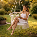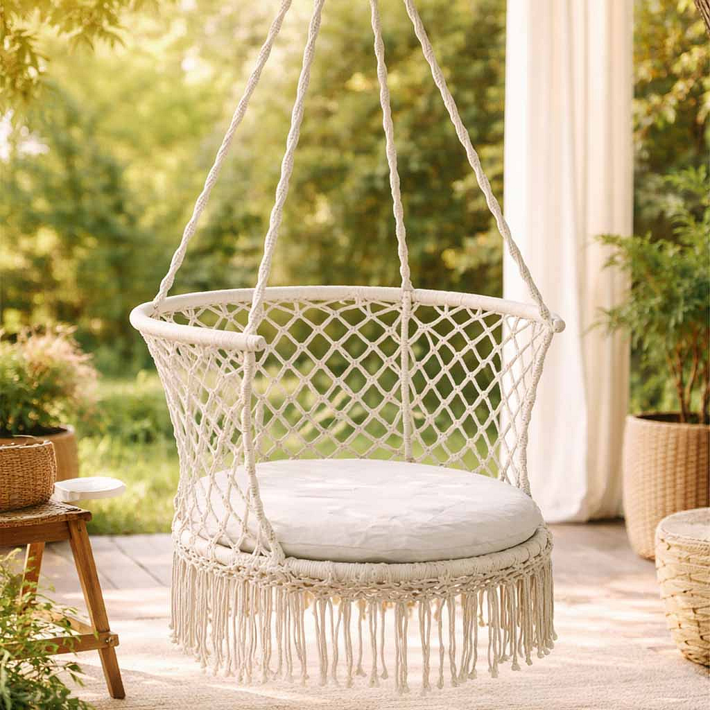 Na houpačce lze sedět rovně nebo po turecku – vyvážená konstrukce minimalizuje riziko pádu. Klasická barevnost v kombinaci s designem v boho stylu se skvěle hodí do moderních i rustikálních aranžmá.