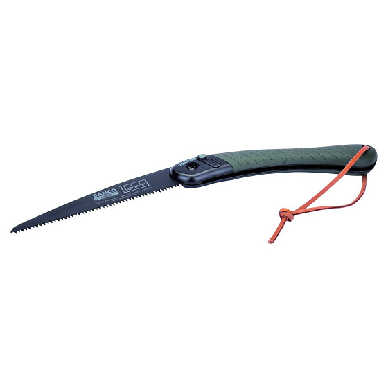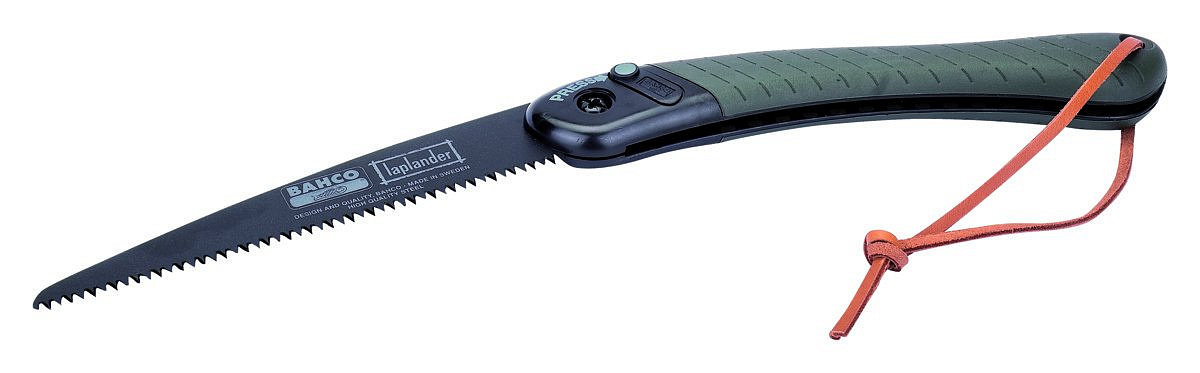 Dvousložková rukojeť umožňuje perfektní držení, doplněná koženým řemínkem. Bezpečnostní pojistka jistí i zavřenou pilku