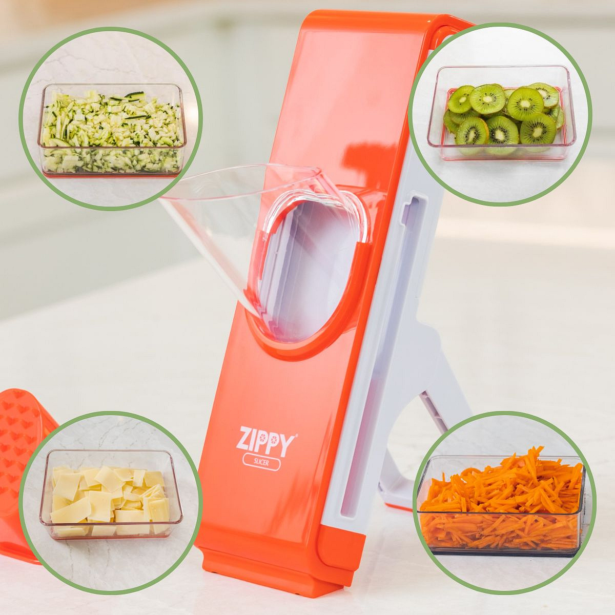 Do you always spend a long time in the kitchen cutting fruit and vegetables and could you use some help while cutting? Then look no further, because with the 4-in-1 Zippy Slicer from Orange Donkey you have the perfect tool at home. With this compact mandoline you can easily and quickly cut, grate and shred vegetables, fruit and cheese.