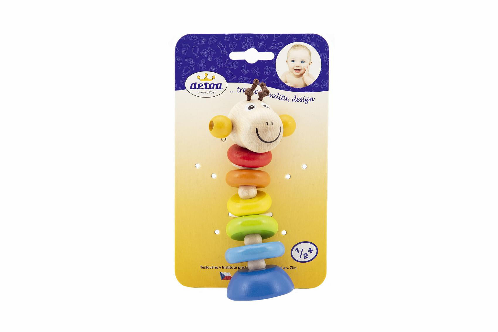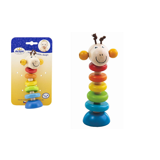 Dřevěná hračka s motivem žirafy. Vhodná k procvičování motoriky rukou a je určena dětem již od 6ti měsíců. Výrobek splňuje požadavky EU na bezpečnost hraček. Výška figurky je 150 mm a je připevněna na papírové kartě. Rozměry balení 10,5 x 17,5 x 4 cm.